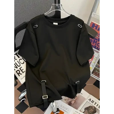 American retro loose black T-shirt, men's trendy hip-hop style, off shoulder sleeve top, unisex, couple style