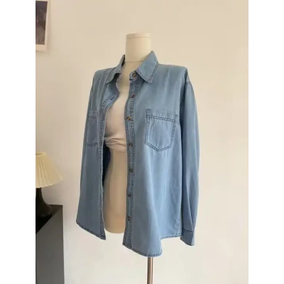 Classic versatile denim shirt for women in spring and autumn, loose fitting outerwear, long sleeved retro Hong Kong style top jacket