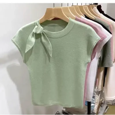 Spring and summer new ice silk knitted short sleeved shirt for women, slim fit and versatile top, cool and breathable base shirt
