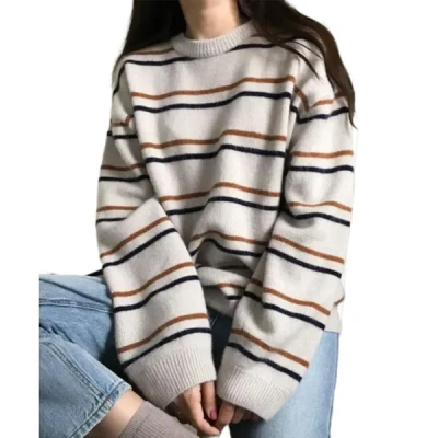 Women Fashion Soft Mink Fleece Stripe Knit Sweater Ladies Stylish Versatile Loose Pullover Sweater