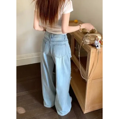 Summer thin jeans for women with ripped holes, loose fit, slimming and versatile wide leg pants, trendy hip-hop and boyfriend style pants