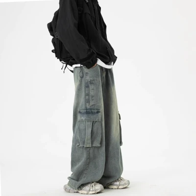 Men's workwear jeans with multiple pockets, loose and trendy casual pants, versatile straight leg pants, spring and autumn styles