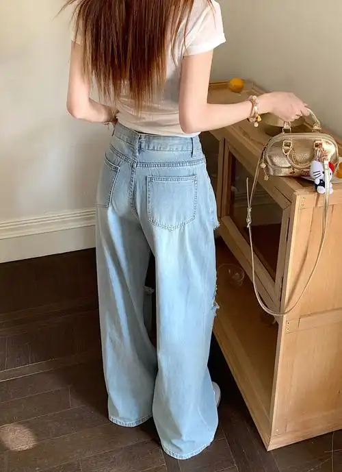 Summer thin jeans for women with ripped holes, loose fit, slimming and versatile wide leg pants, trendy hip-hop and boyfriend style pants