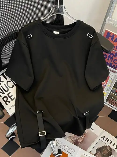 American retro loose black T-shirt, men's trendy hip-hop style, off shoulder sleeve top, unisex, couple style